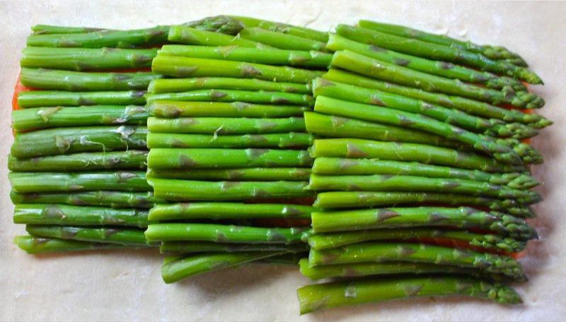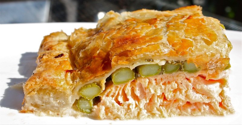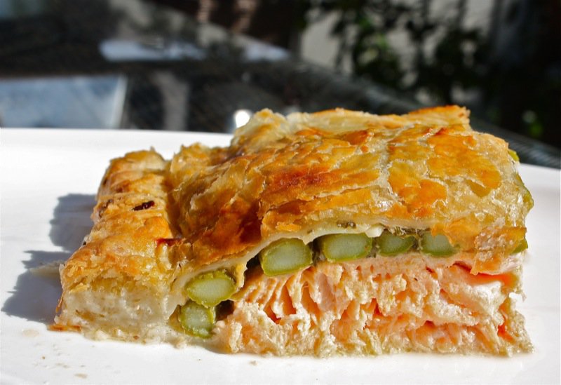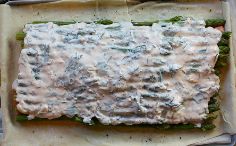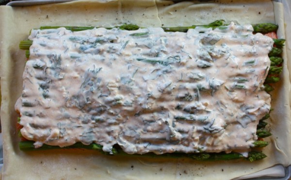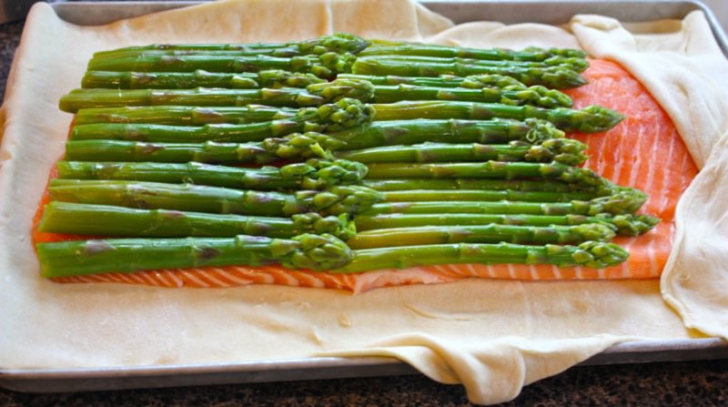 - Brush the margins of the bottom puff surrounding the fish with the egg wash; lay the top pastry over the salmon and press the edges close to the salmon to seal, pushing the asparagus snuggly in place close to the salmon