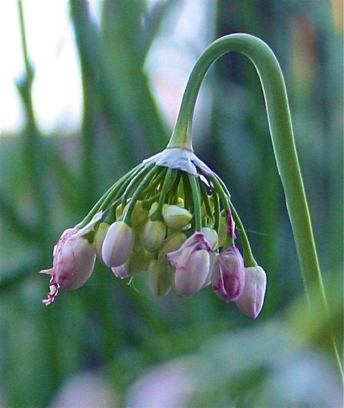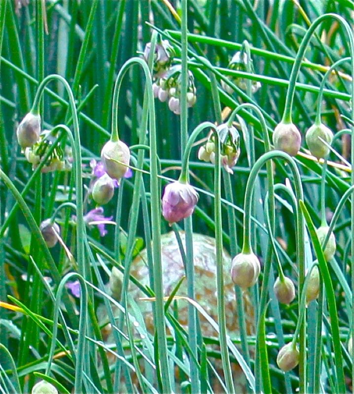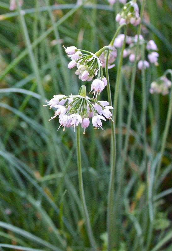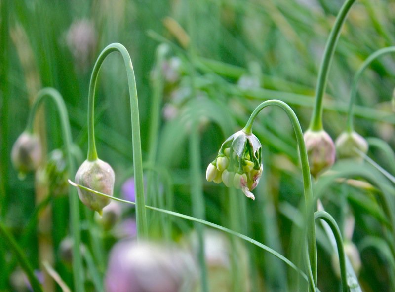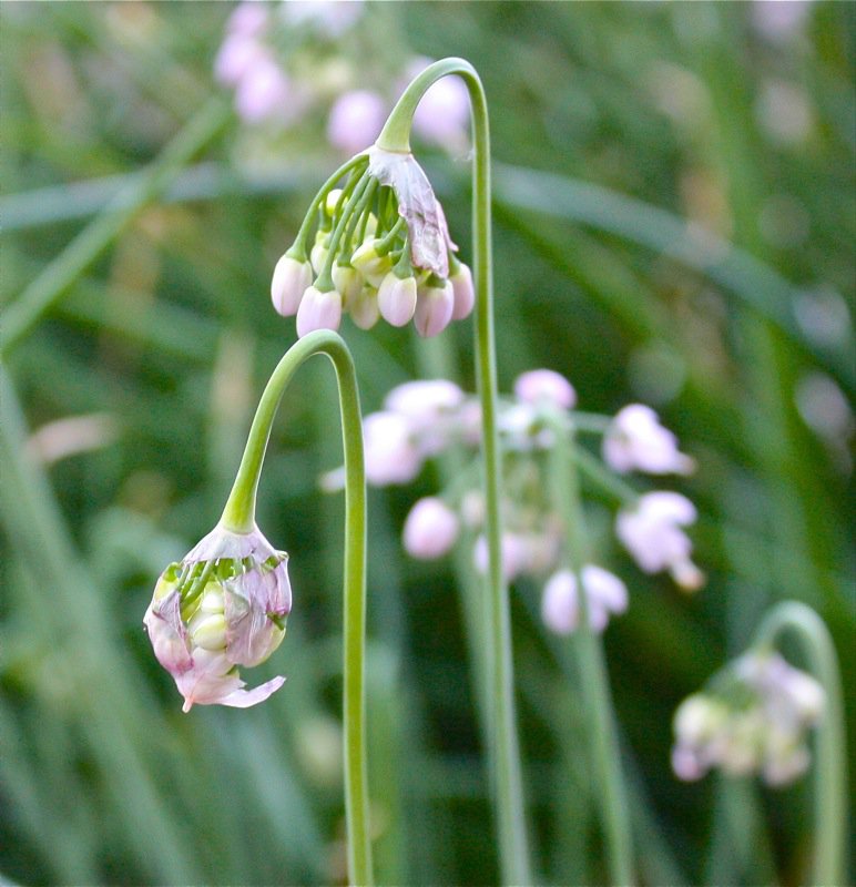 I was tickled pink about three weeks ago when the blossoms started to form and I got to see them nod! As they bow to their gorgeous blossom wrapped in an ethereal translucent pink gauzy film there is a graceful stillness in that part of the garden. There is the whisper of a promise. I can visualize them in the temperate rain forests hundreds of years ago when the Interior Salish and neighboring indigenous peoples whose territories covered Southern British Columbia foraged these as an important traditional cultural food. The stature of the onion echoes the spirit of the people who depended upon it so many years ago. They were usually harvested before flowering, the leaves braided and the bulbs cooked in earthen ovens. MMMMmmmm.
