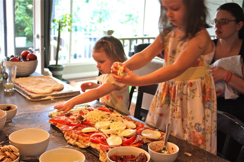 And then we made grilled pizzas. Everyone. And played. And ate, and laughed, and made a great big mess that took five minutes to clean up and had a wonderful day in spite of the ever present rain.
