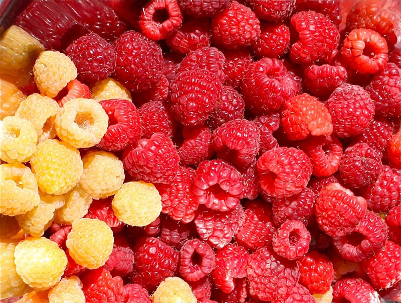 My raspberries were much later than usual this year and not very prolific. I usually get an ice cream bucket full a day every day they are in season from my “hedge”, but this year am getting about a half litre every two days. One kind of the golden raspberries is hardy and lovely and very similar in flavour and shape to the red Bourne. The other is so sweet and fragile that it is only good eaten right off of the bush.