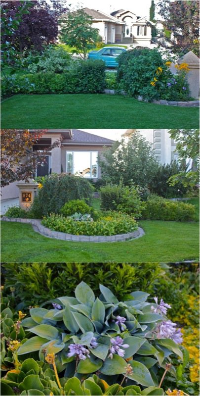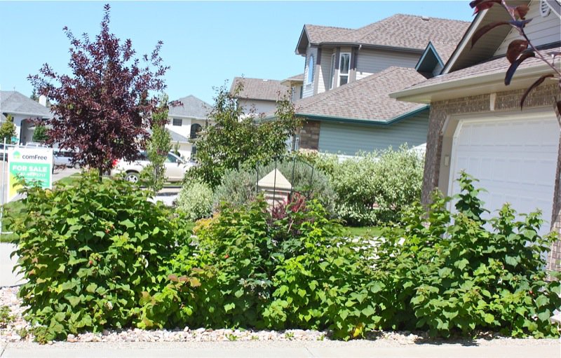 That hedge was planted 8 years ago and is still so small. Last year it started to thrive, and this year it is doing better. There are also more tomatoes behind the Weeping Caragana in the front bed. The Arctic Evergreen Primrose blooms in March (but this year it was May) and then again in October… (border plant in second photo below).