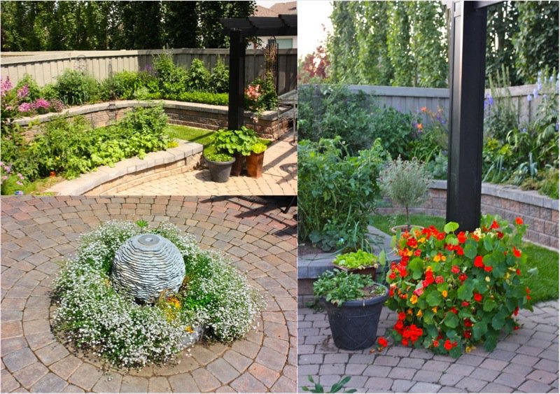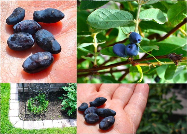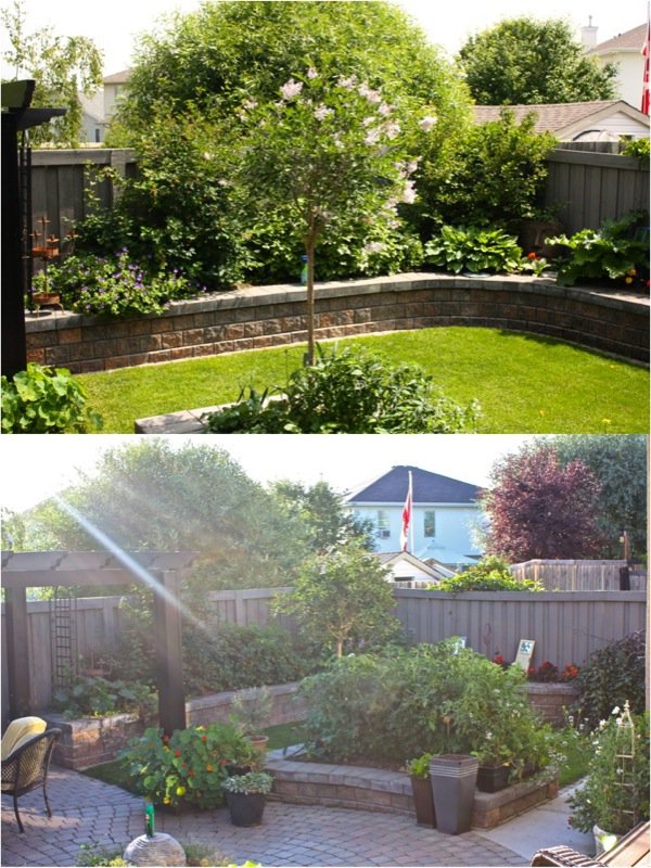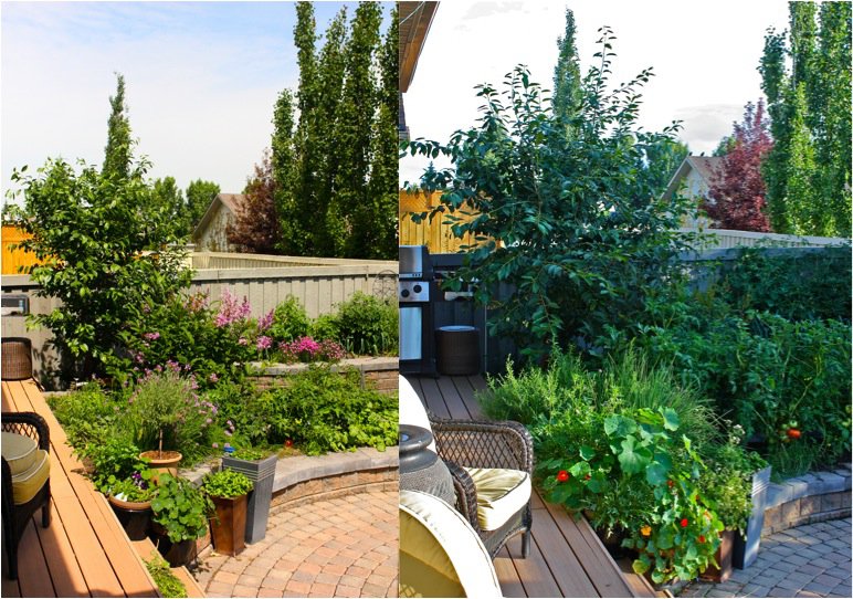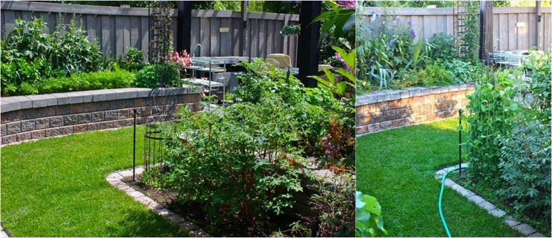 Above, you see my sweetpeas are just rearing their heads at the end of June. That is when the honeyberries bare fruit, too! It really is fantastic to have such early baring fruit in the yard. Below, the corner with the honeyberry bushes. On the left, you will see the June photo with the sweetpeas just out of the ground and on the right you will see how they have grown in only four weeks!