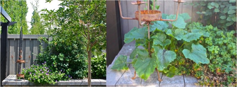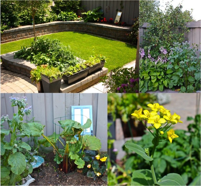 I am sure you can see which photo is of which month. The Hosta’s bloomed at the end of July and are still blooming, but the Borage shocked me. Below, left, you will see the rhubarb against the fence next to the Hosta. To the right, you will see how much the Borage that didn’t exist at the end of June grew by the end of July!