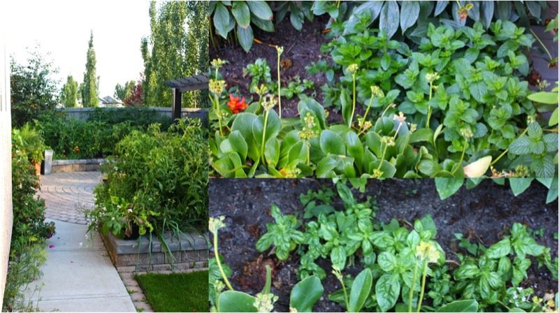 Rhe mint and basil are in the flower bed in the front as it is sunniest there and they are much happier in the sun!