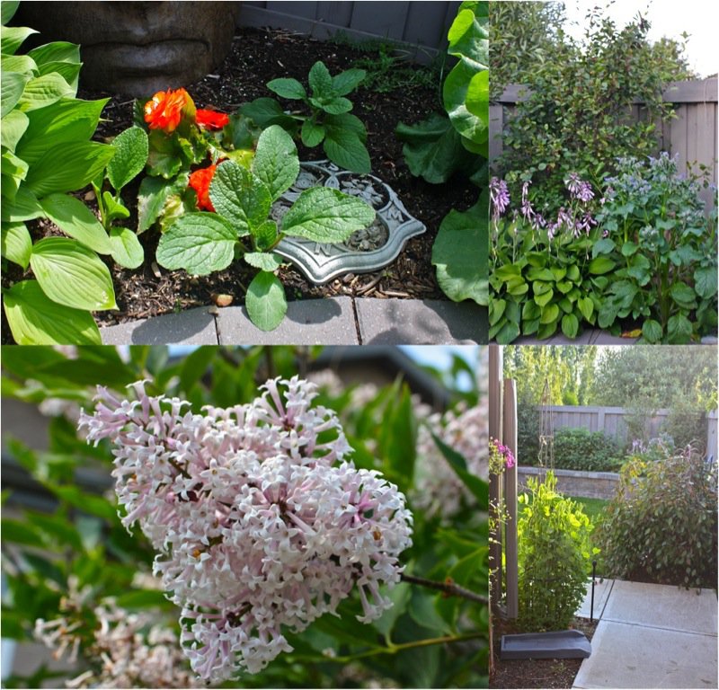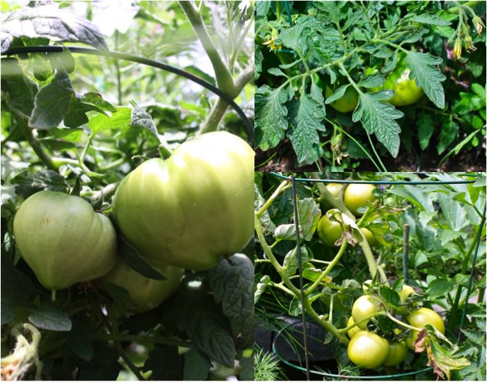 The garlic, leafy greens, and tomatoes from another side of the yard. By the end of July, the tomatoes were almost as tall as the lilac tree!