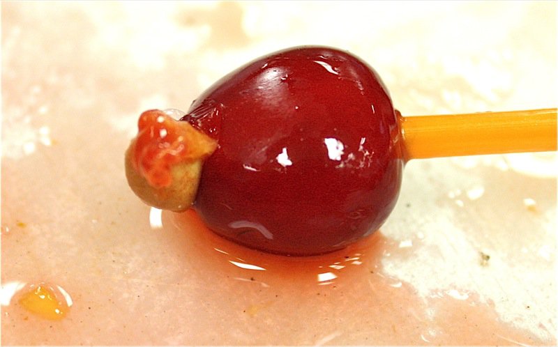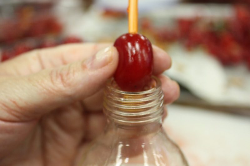 Johwanna supplied us each with a straw that is inserted into the stem end of the cherry over a bottle.