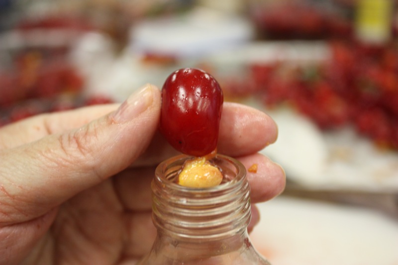 The pit is pushed straight through the cherry and into the bottle: slick and clean! Most of us didn’t use bottles as there were not enough… but it worked well without them, too.