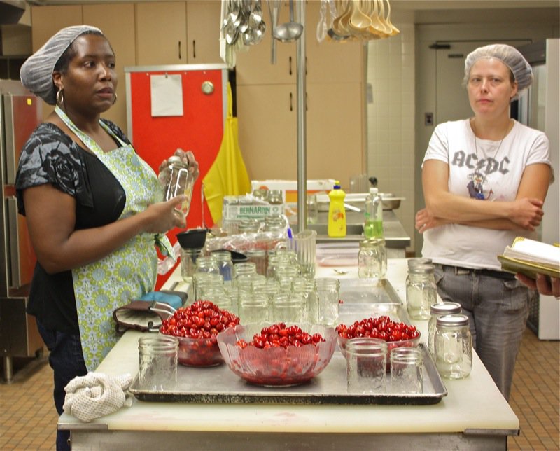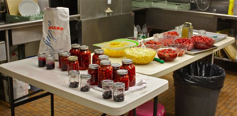 Operation Fruit Rescue Edmonton, or OFRE, was to supply the fruit. The location was St. Josephat’s Parish Hall. Attendees brought their enthusiasm and a box of canning jars. Jojwanna did the rest…Â and life can be serendipitous when one does good work. The Friday before the class, Johwanna received an e-mail from a woman with a giant cherry tree who didn’t want the fruit. Johwanna was there on Saturday and picked the entire three: thirty kilos of cherries! Without that amount of fruit, the canning experience would have been much different. Good things happen to good people.