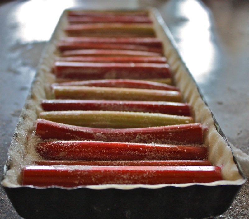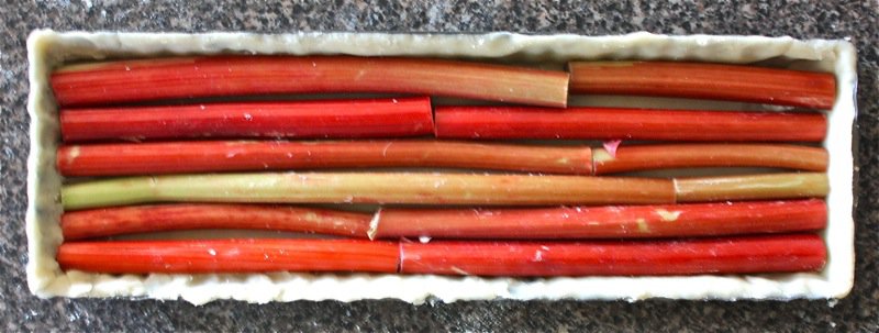 - Cut rhubarb stalks to fit into the tart pan; arrange red and green stalks and thicknesses of stalks to they look appealing