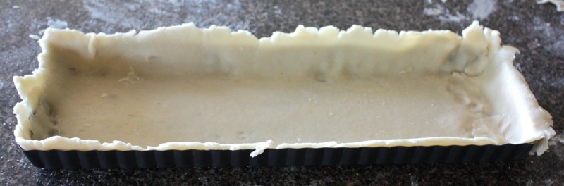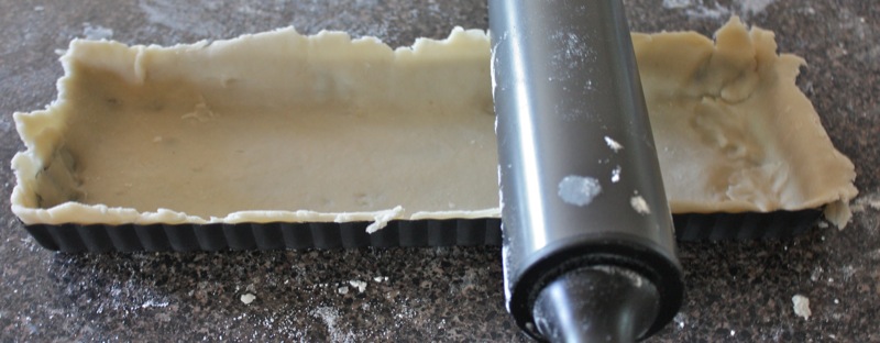 - Roll out pastry into a linear shape, place over tart pan and roll over top to cut off the edges
