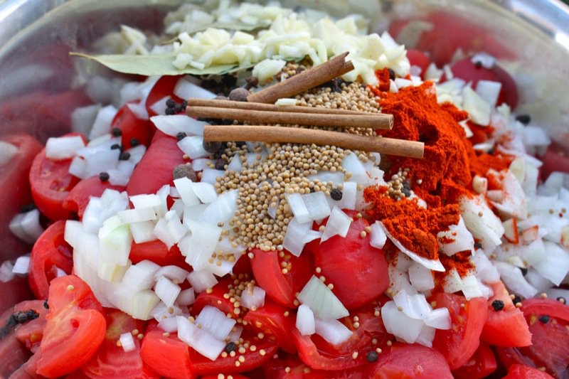 I searched high and low for ketchup recipes, read them all, and then mulled them over and did what we all do: took the best ideas from each one and made up my own. However, I was most influenced by the two-part recipe I found that was at one time on the White on Rice Couple’s website, but is no longer there. I used 15 pounds of Roma tomatoes from the Italian Centre because that is how many I had left from making my salsa. They were beautiful, flavourful tomatoes brought in from BC. I grow a very similar tomato called Amish Paste which I will use to make this next year. I didn’t plant enough this year.