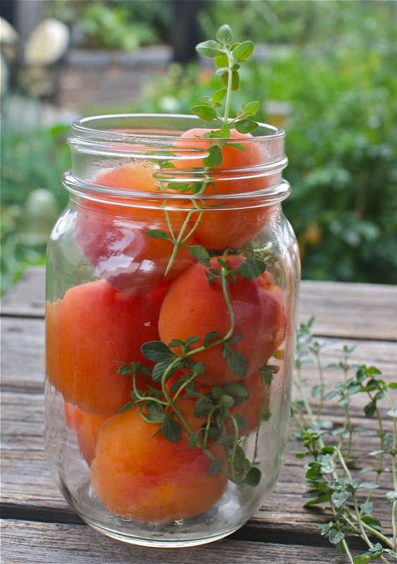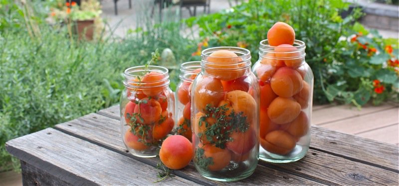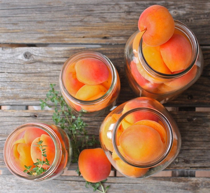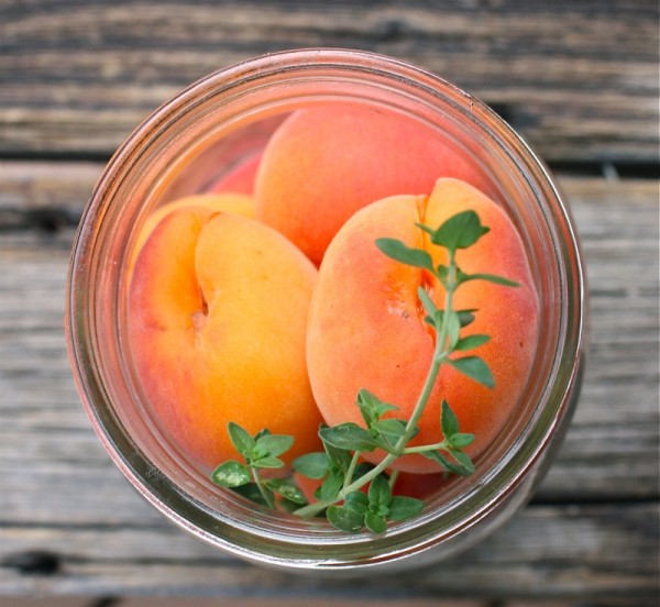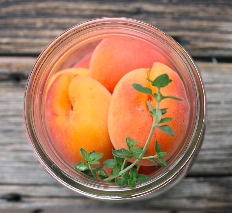 - Place a sprig of lovely thyme into each jar and fill with apricots as snug as possible, without squishing them