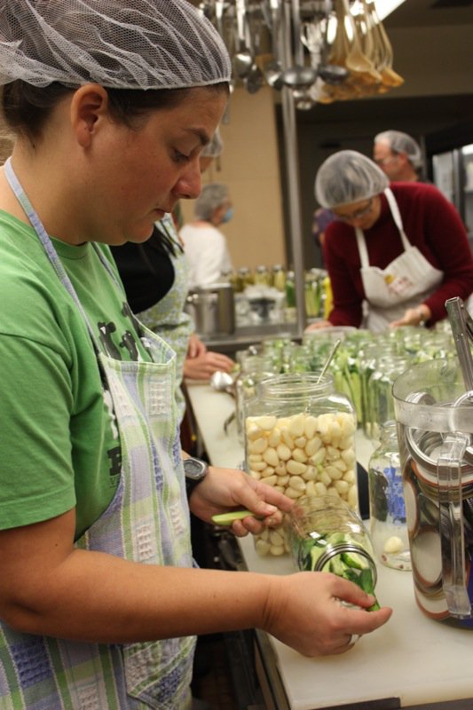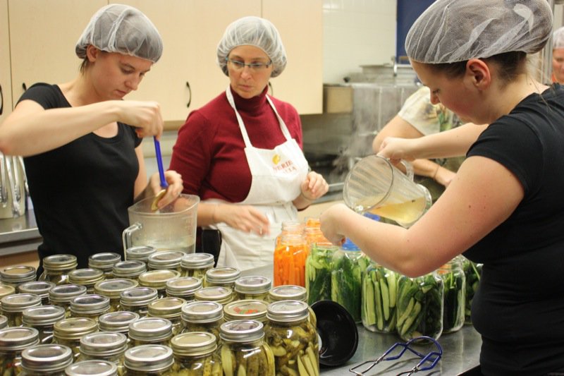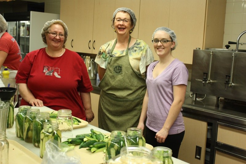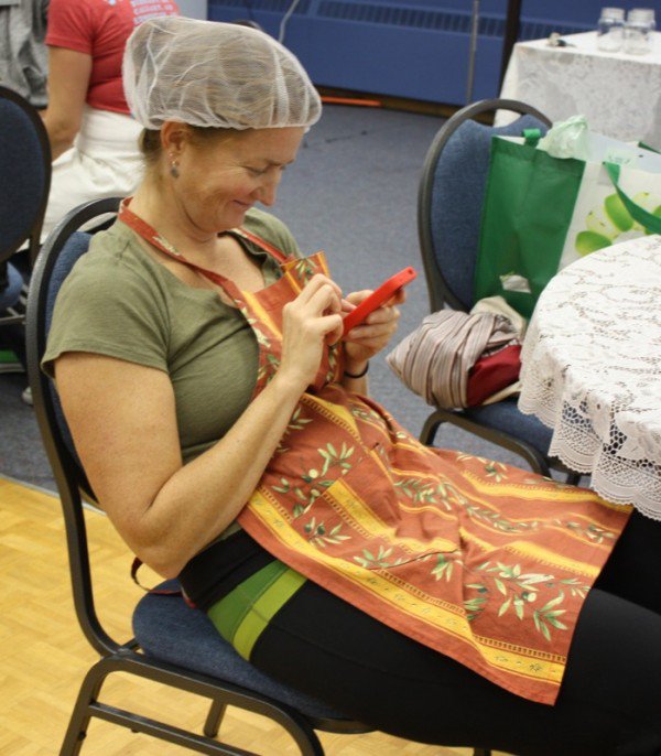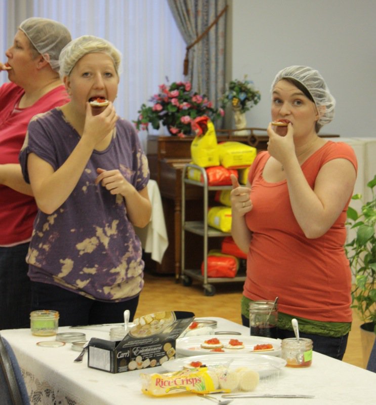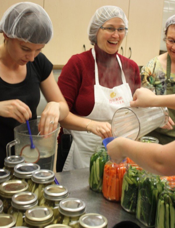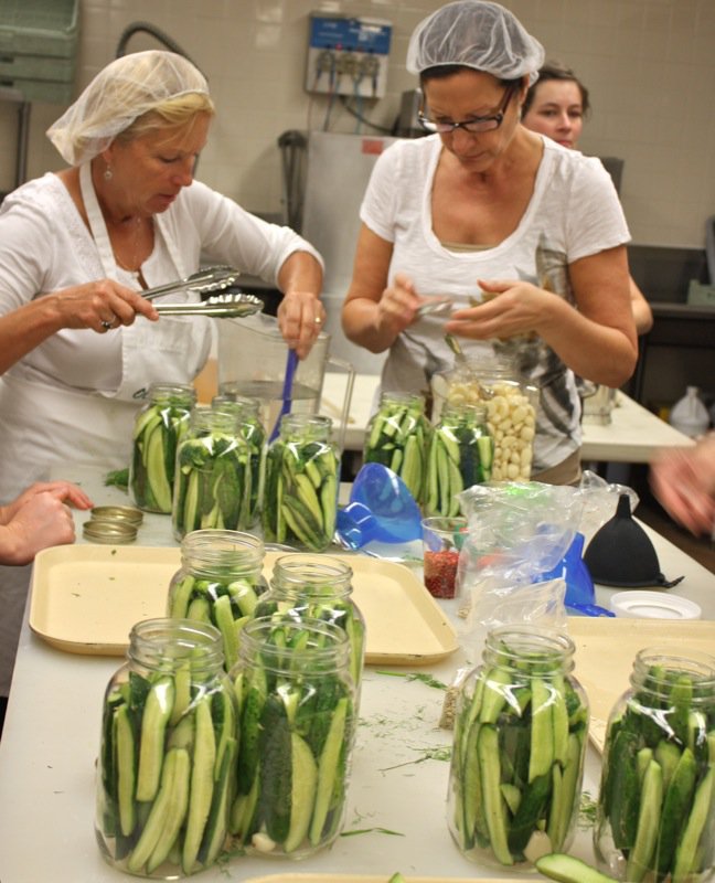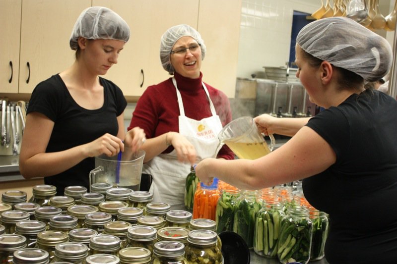 Cynthia Fawcett and friend cuddle during a prime “hair net” photo opp at the second Slow Food Canning Bee this fall! There is nothing like cooking or canning with a friend! Jowhanna Aleyne prepared this day as well as the Fruit Canning Bee in August. You can find the recipes for today here at Edmonton’s Slow Food website. This is my photo essay of our day together!
