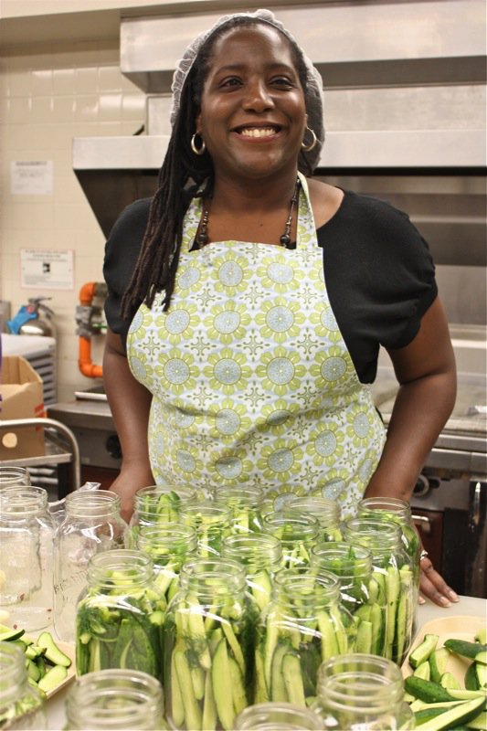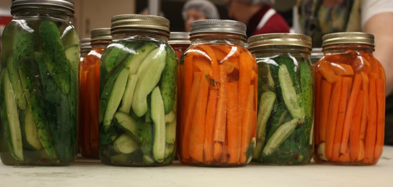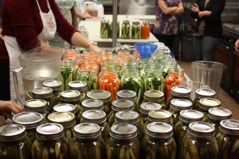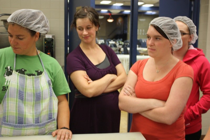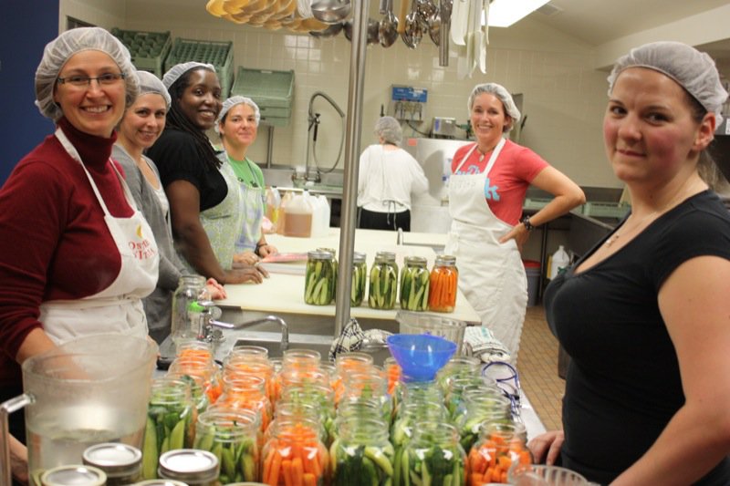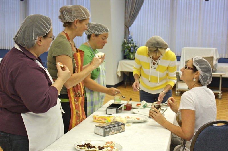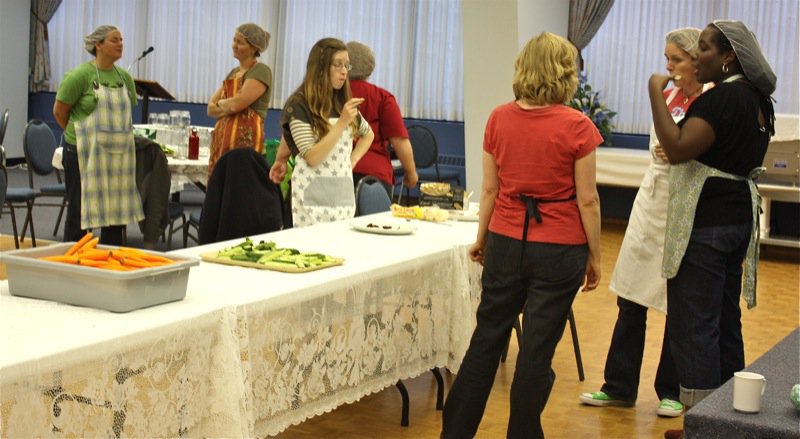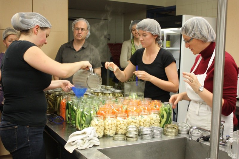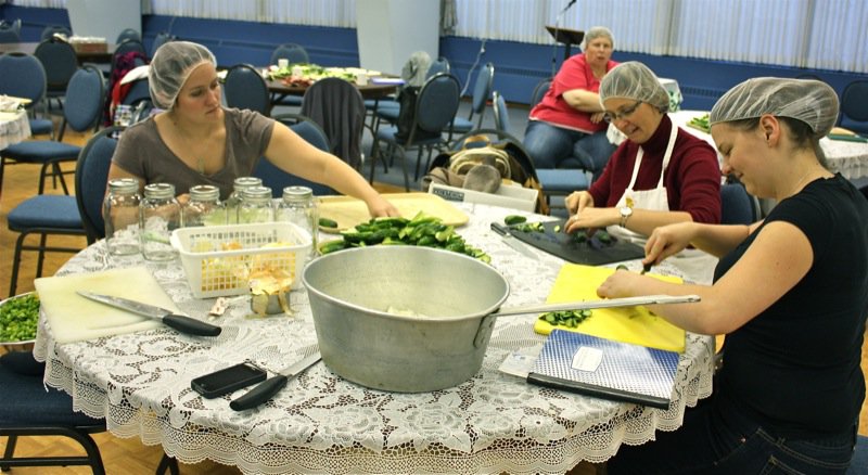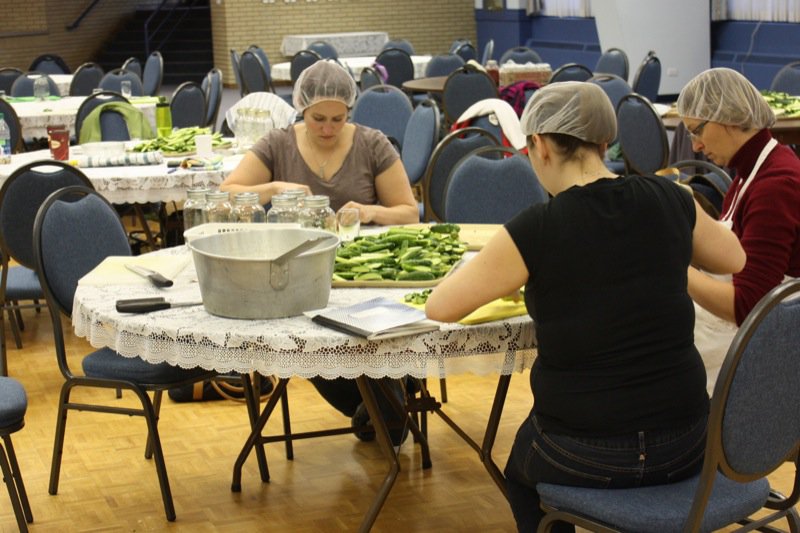 Cynthia Fawcett and friend cuddle during a prime “hair net” photo opp at the second Slow Food Canning Bee this fall! There is nothing like cooking or canning with a friend! Jowhanna Aleyne prepared this day as well as the Fruit Canning Bee in August. You can find the recipes for today here at Edmonton’s Slow Food website. This is my photo essay of our day together!