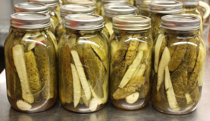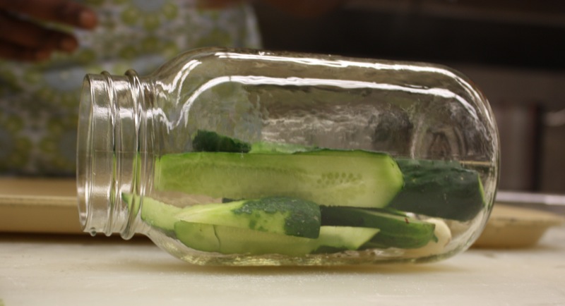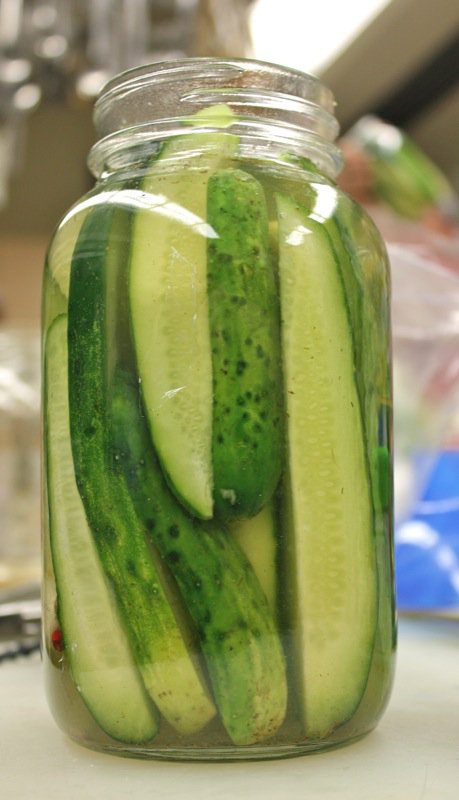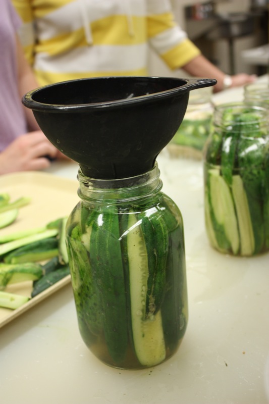 - Ladle hot brine into jar to cover cucumber spears leaving 1/2 inch headspace