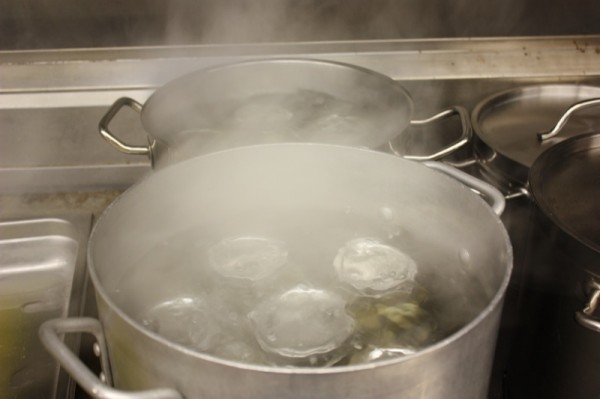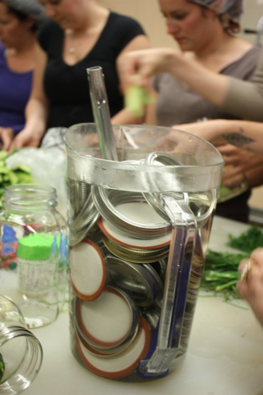 - Heat 4 one pint jars in boiling water and sterilize (scald) the lids, tongs and funnel
