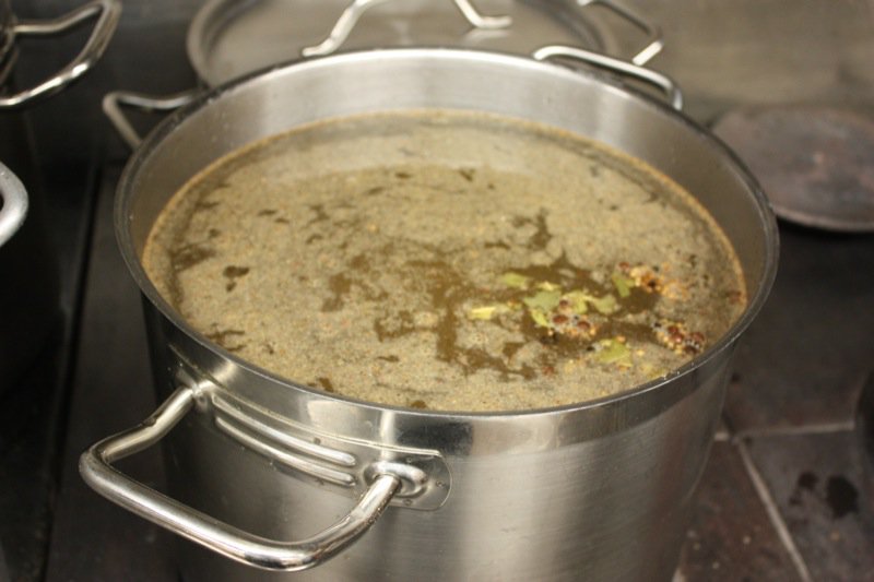 - Combine the next 6 ingredient (#3 to in a large pot over high heat, stirring constantly until sugar and salt is dissolved; reduce and boil gently, stirring occasionally, for 15 minutes