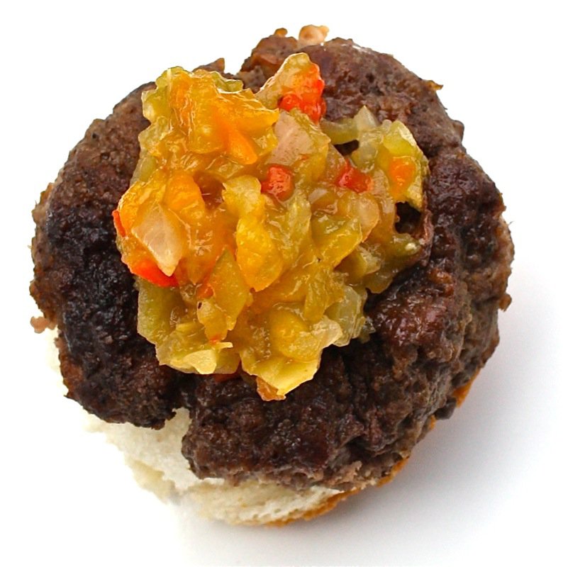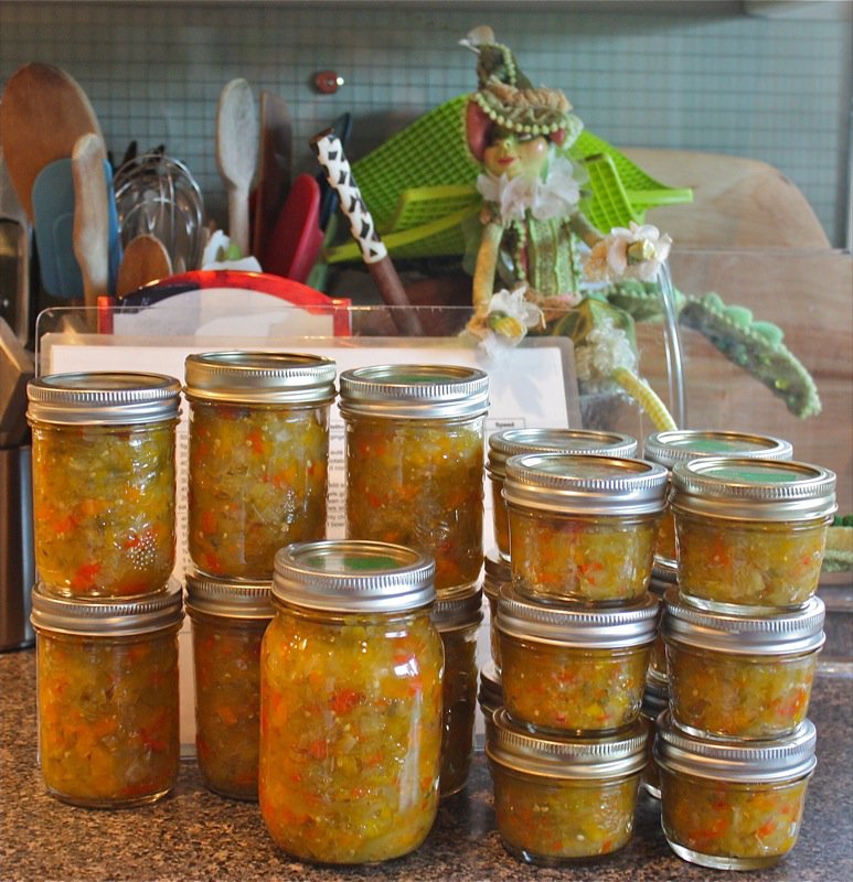 Packing into the jars and then processing the chow chow produced a light sweet and sour tasting relish that is absolutely delicious on hamburgers and sandwiches. Not that I ever ate relish on hamburgers or sandwiches, but I do now. It really makes a difference when you make it yourself, you know what is in it and how good it is for you. I reduced the sugar in this recipe by so much and it is mighty tasty. To us.