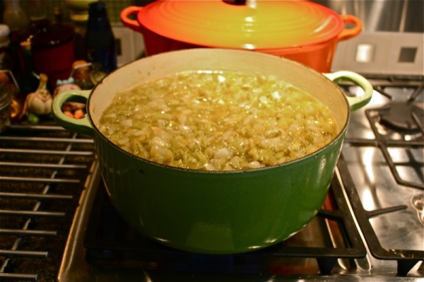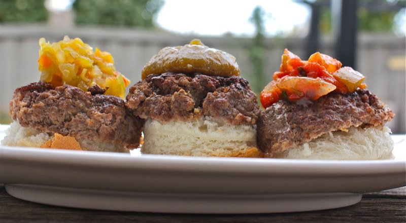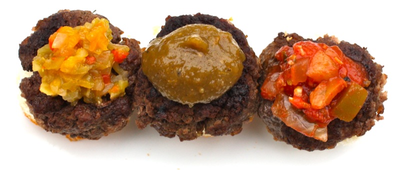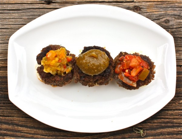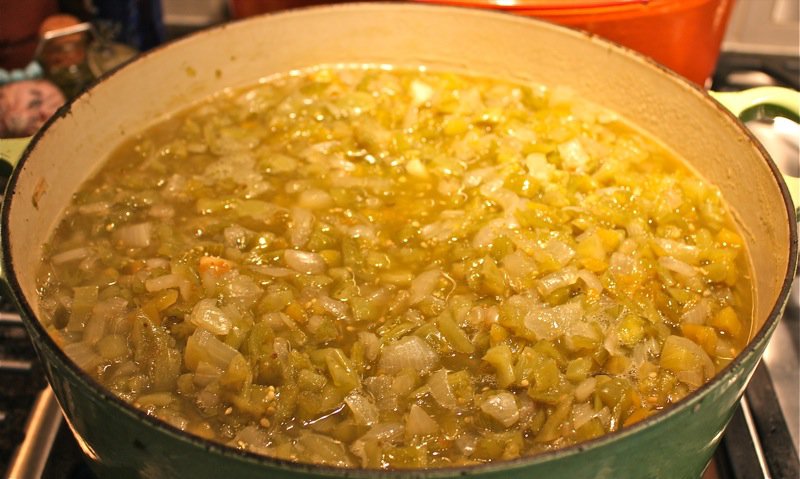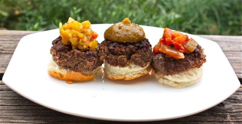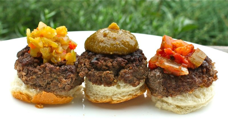 As this was to be my second batch of green tomato chow using Karlyn’s recipe. However, after meeting so many people at Slow Food’s Pickling Canning Bee, and then reviewing Karlyn’s recipe again, I saw it was almost identical to the Quebec Green Tomato Ketchup recipes I had been sent. So, I decided this batch would be Green Tomato Ketchup, instead, and that I would use Karlyn’s idea of the apples to thicken the sauce. See my three new condiments on the sliders, below: Green Tomato Chow Chow, this Green Tomato Ketchup, and Peppy Salsa!