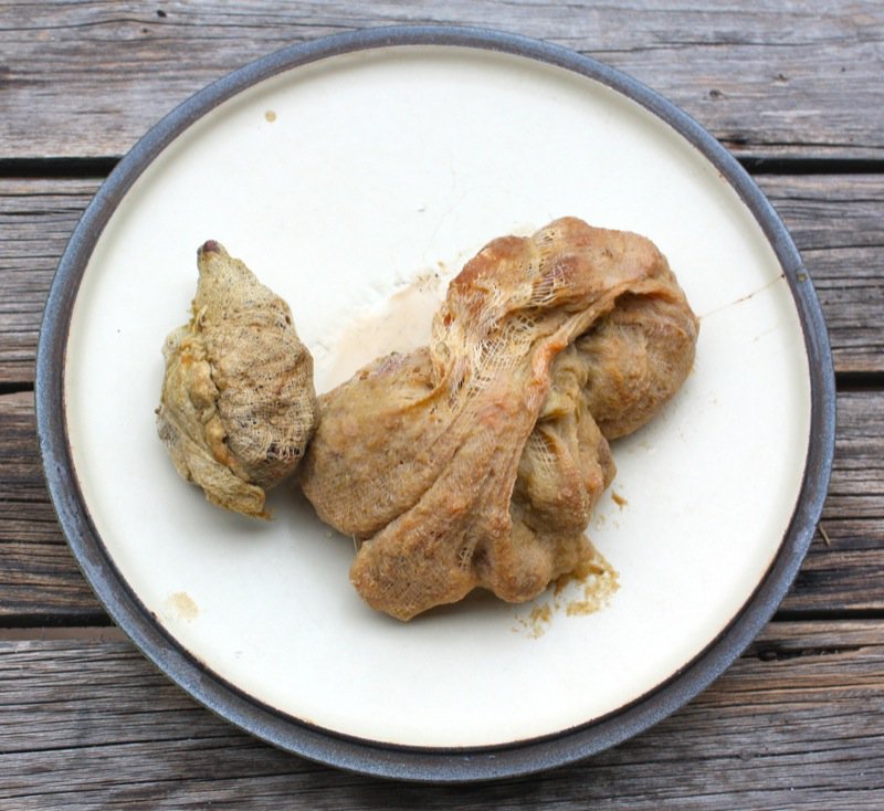 Lots of liquid to pour off here. I used apples from our tree as the natural thickener or pectin for this recipe as suggested by Karlyn.