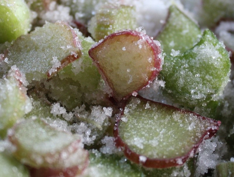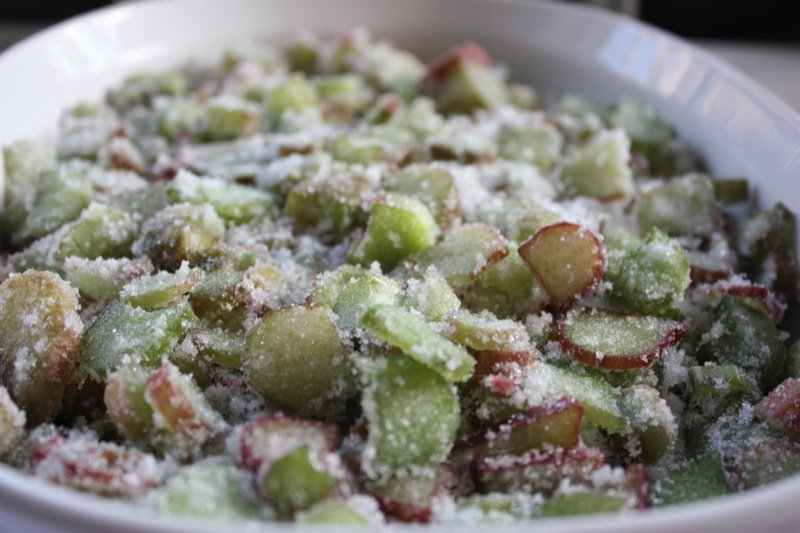 I was actually going to make a rhubarb crisp, and covered the sliced stalked with sugar and set it in the fridge until later. Later never came. Well, it came – but, waaay later! A week later, at least.