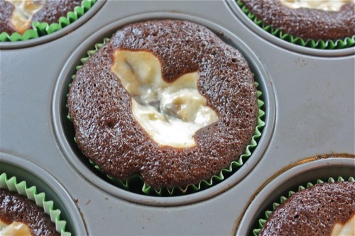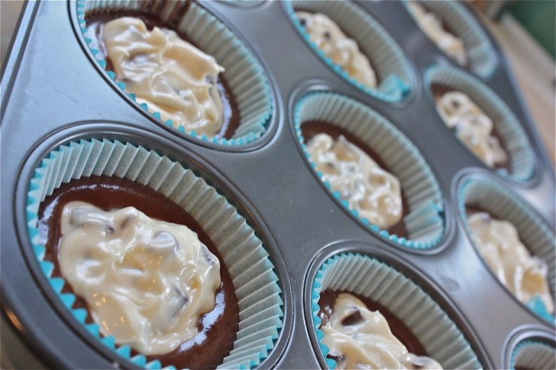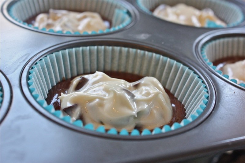 - Fill muffin cups 1/3 full with chocolate batter, then top with a heaping tablespoon of the cream cheese mixture. Bake in the preheated oven until the tops spring back when lightly pressed, 20 to 25 minutes.