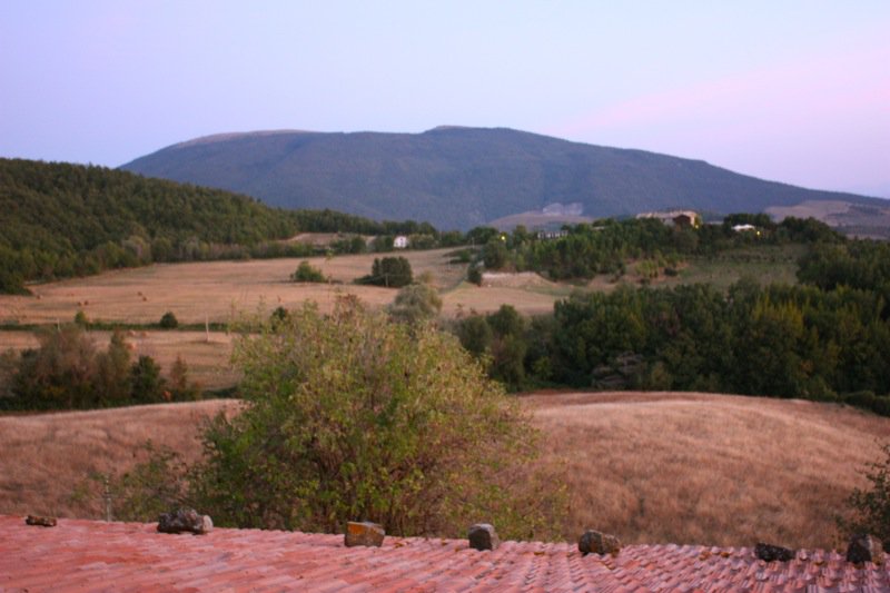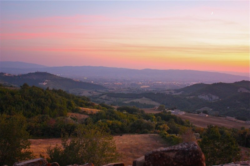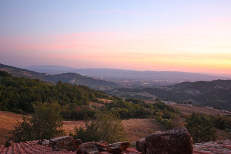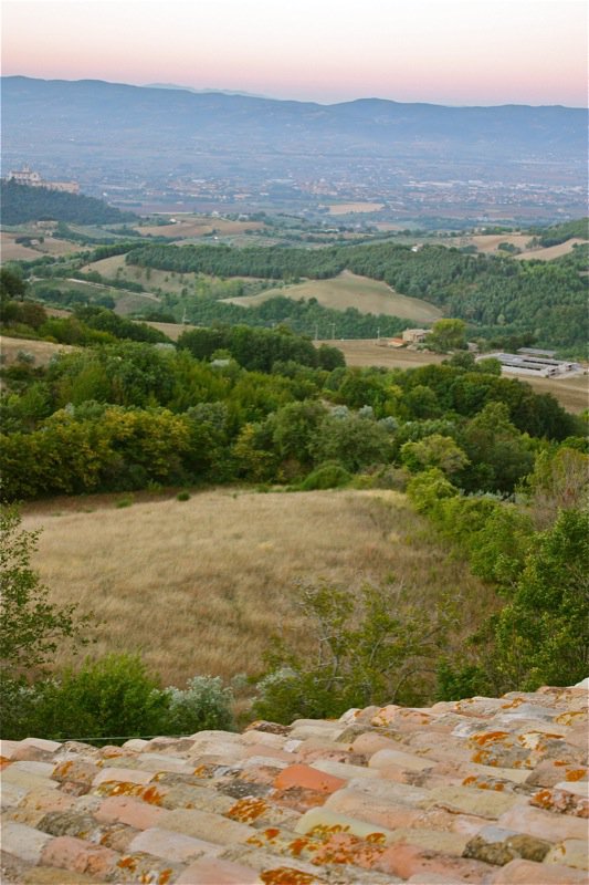 But, who could sleep through such a sunrise, anyway? Do you see Assisi in the third photo? (The large rocks on the clay roof are holding down the terra cotta shingles.)