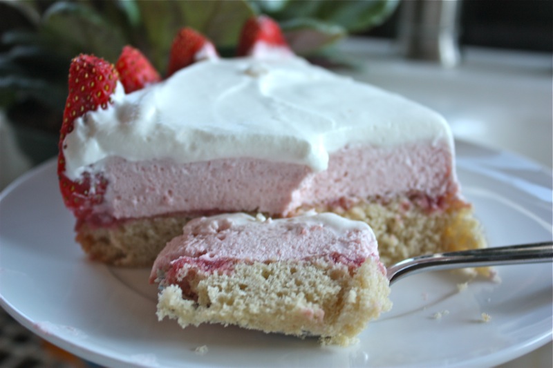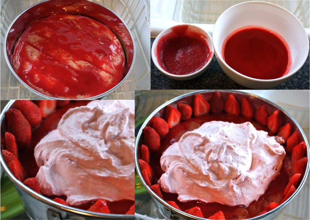 To intensify the strawberry flavor of the dessert and to moisten the sponge cake, strawberry puree is spread over the sponge cake before adding the cut strawberries and cream. Also, make sure to use strawberries of equal size to line the pan so you have a uniform look.