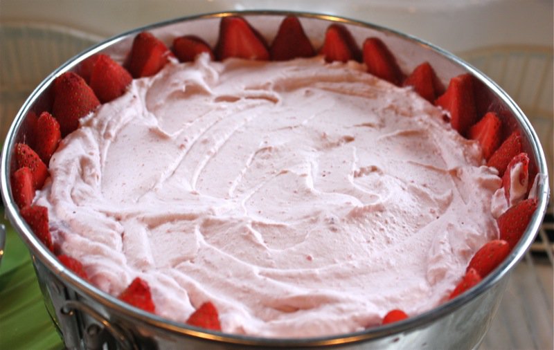 - Fill the center of the cake with the strawberry whipped cream; smooth the top