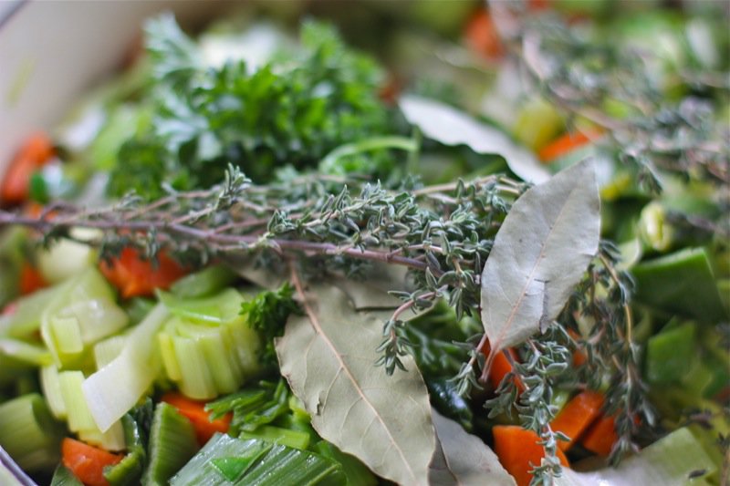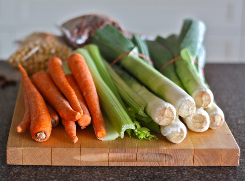 - Cook leeks, carrots, celery, and garlic in oil with herb sprigs, bay leaf, cloves, and 1/2teaspoon each of salt and pepper in a large heavy pot over medium heat, stirring occasionally, until softened and golden (about 20 minutes: my pan is huge and this huge batch does fit if added in stages)