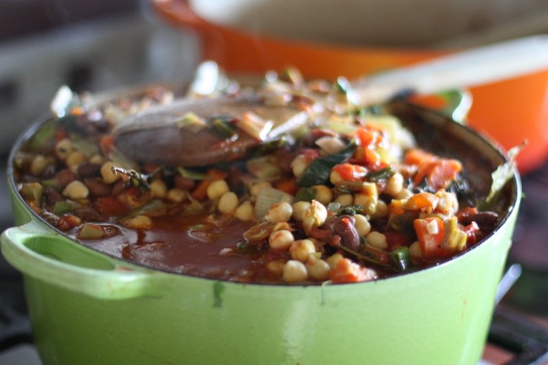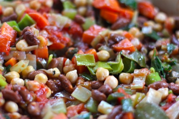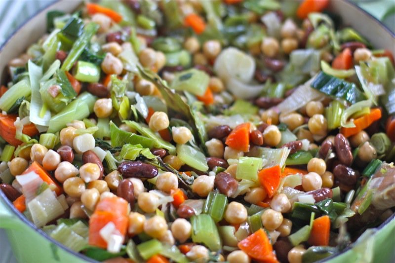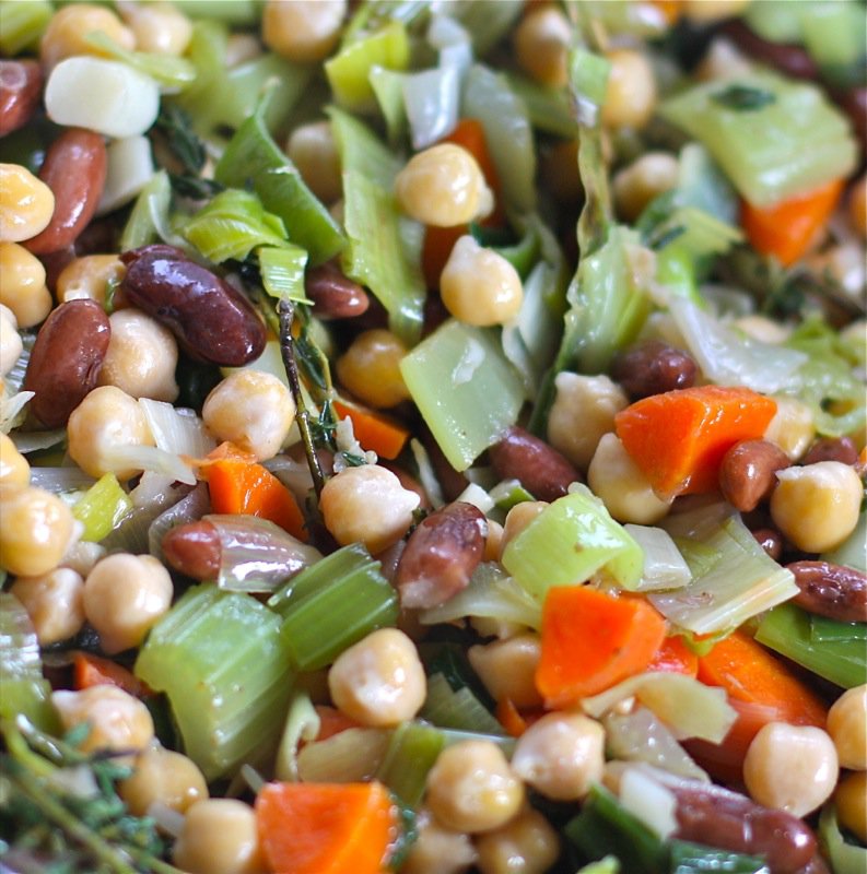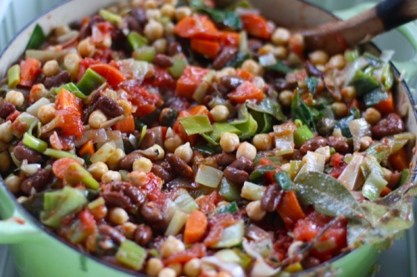 - 6 c Great Northern beans, rinsed and drained (I rehydrate my own the night prior, and cook separately without salt to desired doneness; this time I used what beans I had available through Live Local from Vauxhall Seeds: chick peas and Cannellini beans are)