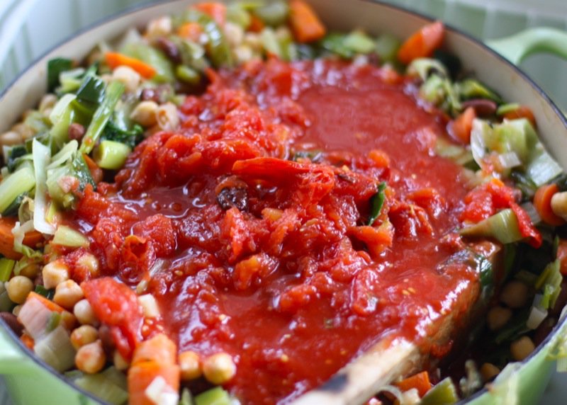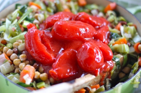 - Stir in beans, then tomatoes, and tomato paste, paprika and simmer, partially covered, stirring occasionally, until carrots are tender but not falling apart, about 15 minutes