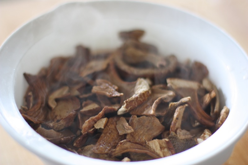 - 1 ounce dried porcini mushrooms soaked in 1 cup of boiling water (Mo-na Foods)
