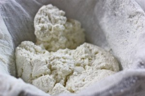 - Cover sieve with three to four layers of cheese cloth set over a big bowl to catch the whey