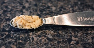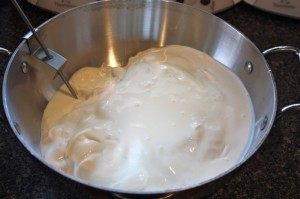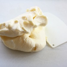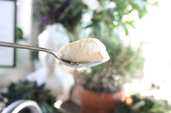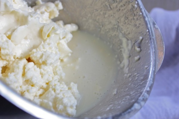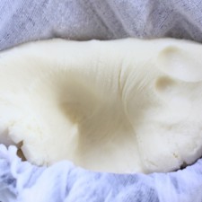 I still haven’t put in any online orders for Cheesepalooza cheese making, yet, so Ian met me in a parking lot with the powdered mesophilic starter. It was like I was a secret agent and we were participating in an illegal clandestine meeting exchanging contraband. When I went to use the starter, it was not powdery. It was kind of sticky. It was similar to the melted residue from cotton candy. Not quite so sticky, but a little more clay like. The texture was so odd that I was not sure that the process would work; however, the brunch was in two days, so I could only succeed or fail. There was no time or place to get more culture. I broke it into tiny bits and sprinkled it over the thick cream.