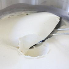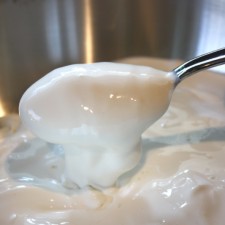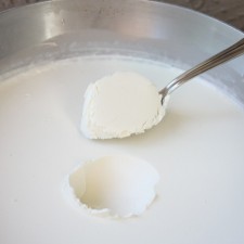 After stirring the culture into the cream, it had to rest on the counter, lid on, for 12 hours, and then go into the fridge for 12 more hours. Something was “working” when I peeked under the lid 24 hours later. The previously thick and luxurious mass was solid.
