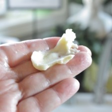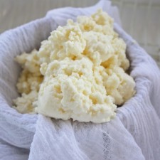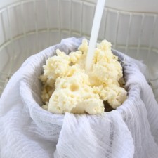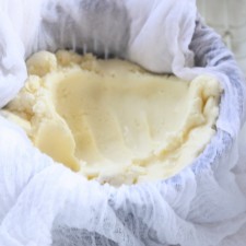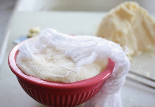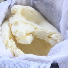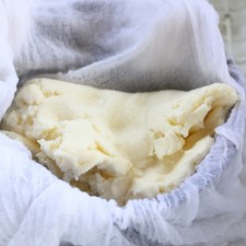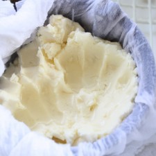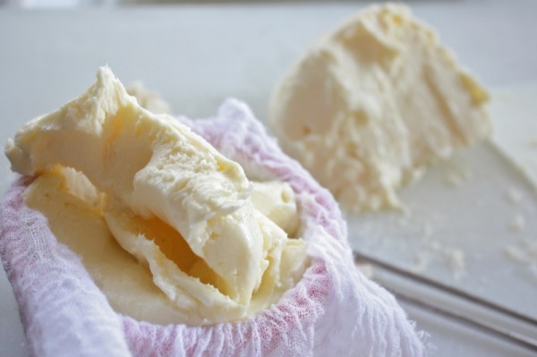 I almost “won” a bid on a gorgeous antique wooden butter mould on e-bay with gorgeous hand carved wheat shafts, but at the last minute, someone swooped in and I was done. So, my eye is still there. Meanwhile, I just used a bowl and some cheesecloth. The yield was double what you see below: about 2 large cups of butter.