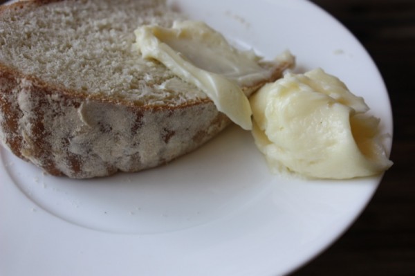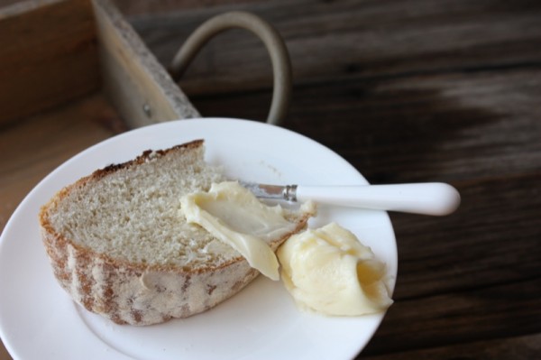The wedding “meet-the-groom” brunch begged homemade butter. I had made ricotta and yogurt cheese, and all the ice-creams, and granola and crackers and was making cinnamon buns and bread. Well, everything was as homemade as possible, and there were many other items on the menu. Thus, butter was logical and it had been on “the list” for quite some time. I have made “butter- butter” before. Uncultured butter, that is, or “not cultured butter”, rather? No butter is as delicious as homemade butter! Now, I have to make “butter-butter” again right away to compare to this lovely cultured butter.