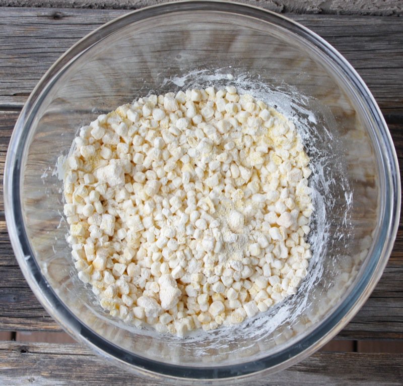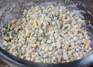 Freshly scraped corn niblets combined with the flour, above left. Remaining ingredients for the corn fritters, sans beer, above right. Close-ups below.