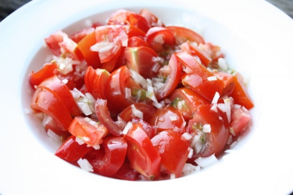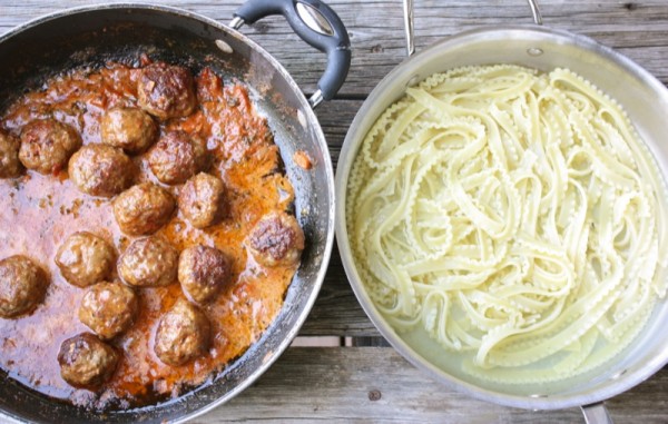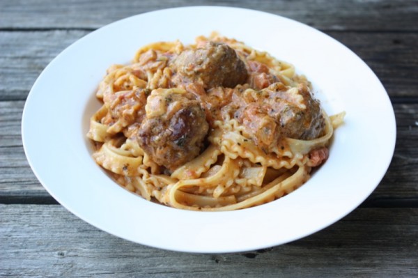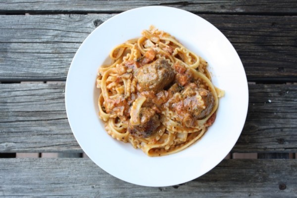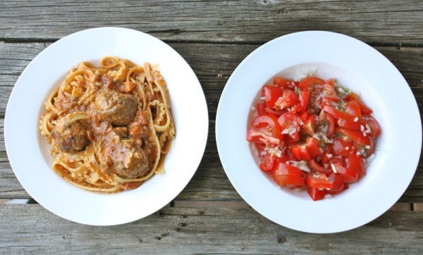 When I make meatballs, I always freeze 3/4 of the batch for other meals. A frozen package of my always-on-hand and used-to-enhance-so-many-dishes Best Ever Homemade Tomato Sauce was thrown in with the browned balls, a little cream was added. This wide crimped pasta is a favourite of ours. I cooked it at the same time, tossed it with the sauce and served this in one bowl. Three meat balls contained one quarter pound of beef. The ultra simple tomato onion salad on the side was the perfect compliment and rounded out the necessary fresh component needed for this simple family evening meal.
