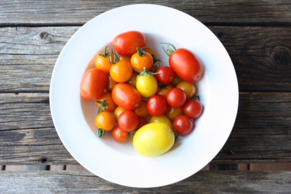 Maybe this is the rhythm of our garden: the raspberries have just finished and the tomatoes are ready! They have been presenting their rosy little cheeks the last couple of weeks now, but only enough ripening to make the watering and weeding fun. Now, however, the bushes are bursting with colour and lively life! I just ran out to pick a few for supper tonight, and look at this harvest!