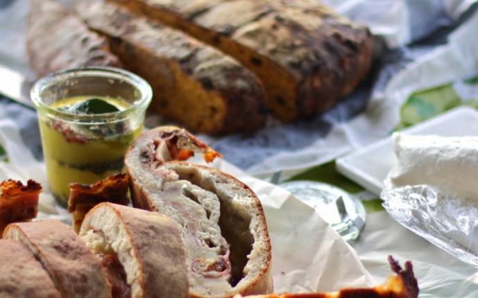 Arriving 30 minutes early, it was minutes before we had the tablecloth spread on the porch table and a picnic breakfast spread for all. Addie had an incredibly delectable loaf of freshly baked carrot bread with toasted cumin seeds on top that paired perfectly with the Potted Little Goat that I brought. I also brought some chèvre and a yummy sandwich type of loaf I had just baked the night prior with my oven dried tomatoes in it. I will make it again and post it, but got the idea from Lisa Michelle, one of our Cheesepalooza participants!