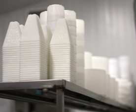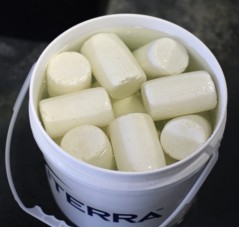 Time to turn the feta. So beautiful. Just a little tap on the table and it falls back into place. Look at how many they made the day before! There were three or four buckets like this. Leslie asked us if we would like it cubed or whole… and we chose “whole” which meant half of each of these in a brine solution.