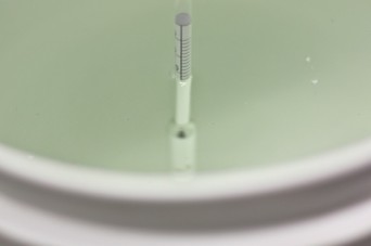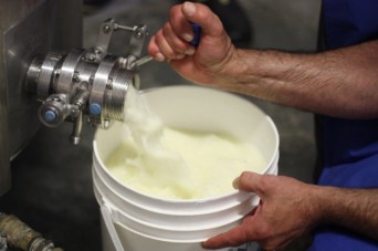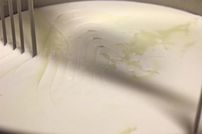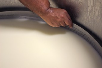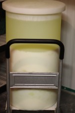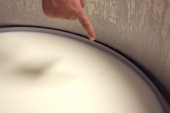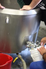 Moulds were sterilized and ready to fill. Now, the whey must be removed from the tank. Alex sanitized the screen that fits in place in front of the drain, and placed it there. Can you see it, below? Addie is pointing.