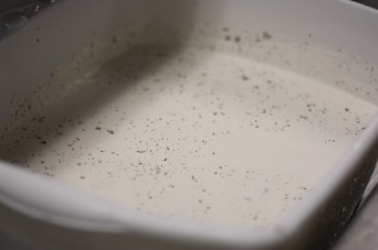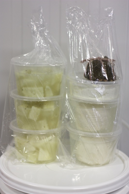 The Halloumi had been pressed, and we were now going to brine it in its own whey. Leslie’s whey is much whiter than mine, as well. Mine is the traditional yellow colour, like above, over the yogurt. “It would be delicious to drink with all that mint in it!” I overheard Ian comment to Addie and had to agree. Definitely would be a yummy whey that must be used in something.