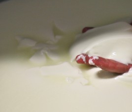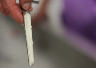 Ian then told me you can also tell if the curd is ready when you take a bit and gently squeeze it, as I did, below, and it holds its shape.