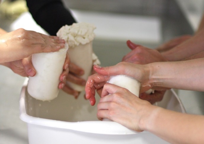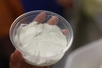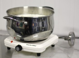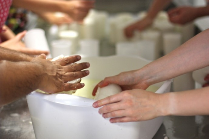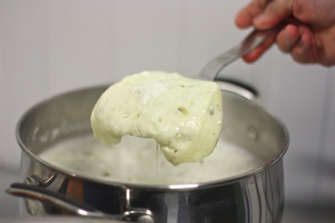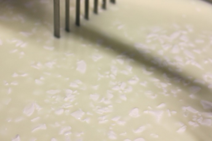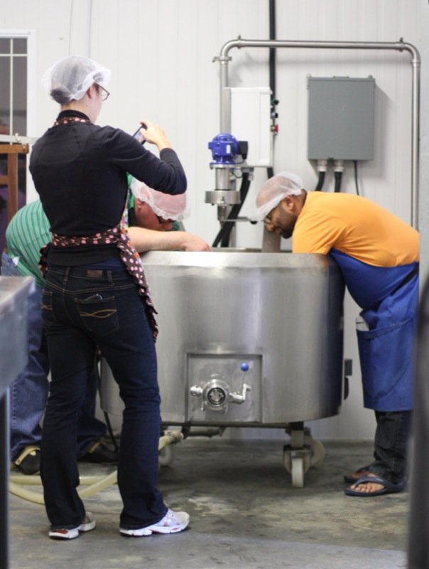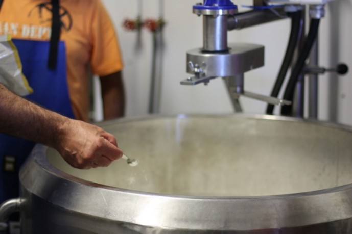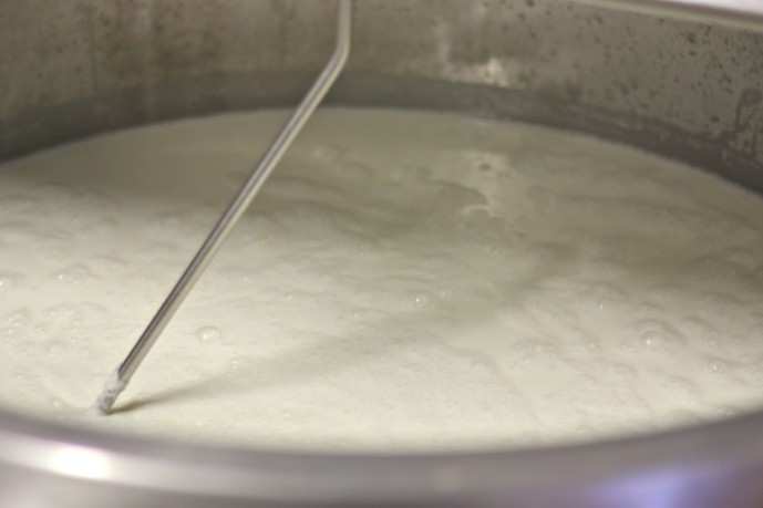 While some participants learned the up and down stirring motion required after the coagulant or culture is added during cheese making, others were focusing on the Halloumi which was looking pretty delectable in its melted state. We wanted to pull it and see what would happen if we stretched the curd. It was decided we would do it with the last batch, but we forgot or were too tired by then. Not sure which.
