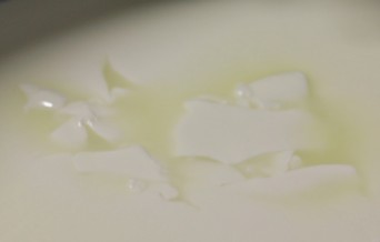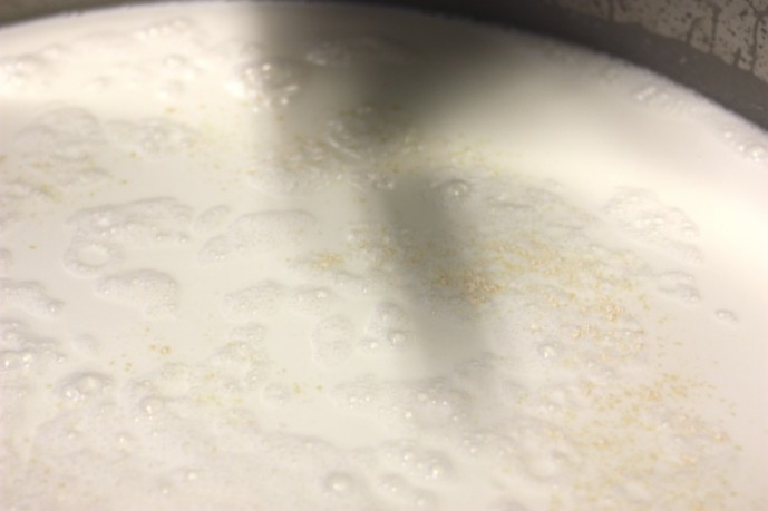 While the Halloumi was underway, the milk for the feta had been heating to temperature, and was now there. The ingredients needed to be added to it. “Oh, I had expected a more professional set up!” Addie teased as Leslie brought our her Tupperware container filled with magic potions: thermophillic and mesophillic cultures etc. “Hey, we are a very small artisanal cheese maker!” Leslie laughed back. It made me feel much more confident! (Most likely with dire consequences to follow!)