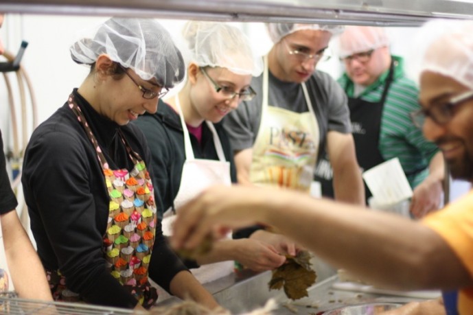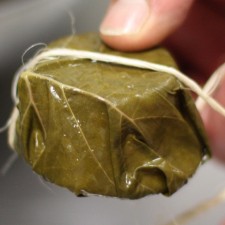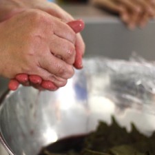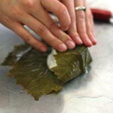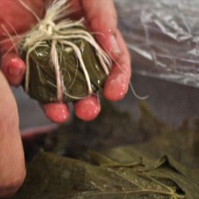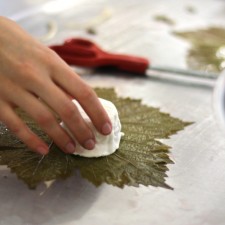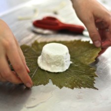 As the feta was resting for an hour, and the Halloumi was being “cooked” there was a little time to do something else, and magically, Leslie had this planned, too. She brought out the grape leaves she had rinsed well from their brine and had soaking in a red wine. Wine and cheese? Buy their Banon!