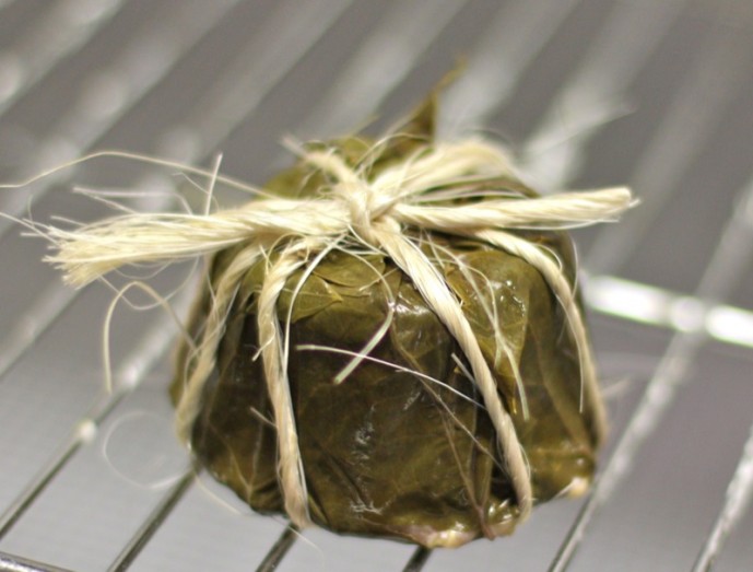 Out came the little discs of goat cheese that she makes like chèvre, but in a small mould, then adds a white mold and ages for a week or two. She demonstrated how to wrap up the leaves and we had another party for a while!